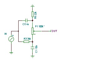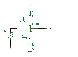 In the example here, frequency is f = 1/ (2 x Pi x R x C) = 1/ (6,283 x 10 000 x 0.00000001) = 1600 Hz, as a consequence Pot value is 10k x 10 = 100k.
