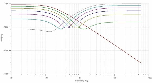 - Red curve is the Pot at 0% - lowpass filter - with -0.4dB Gain
